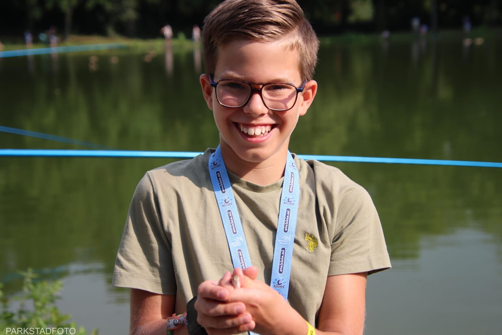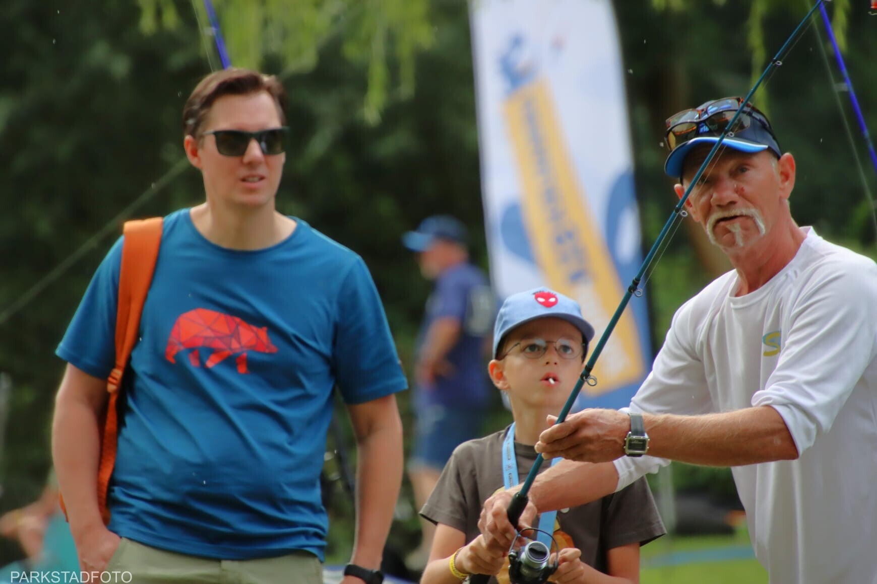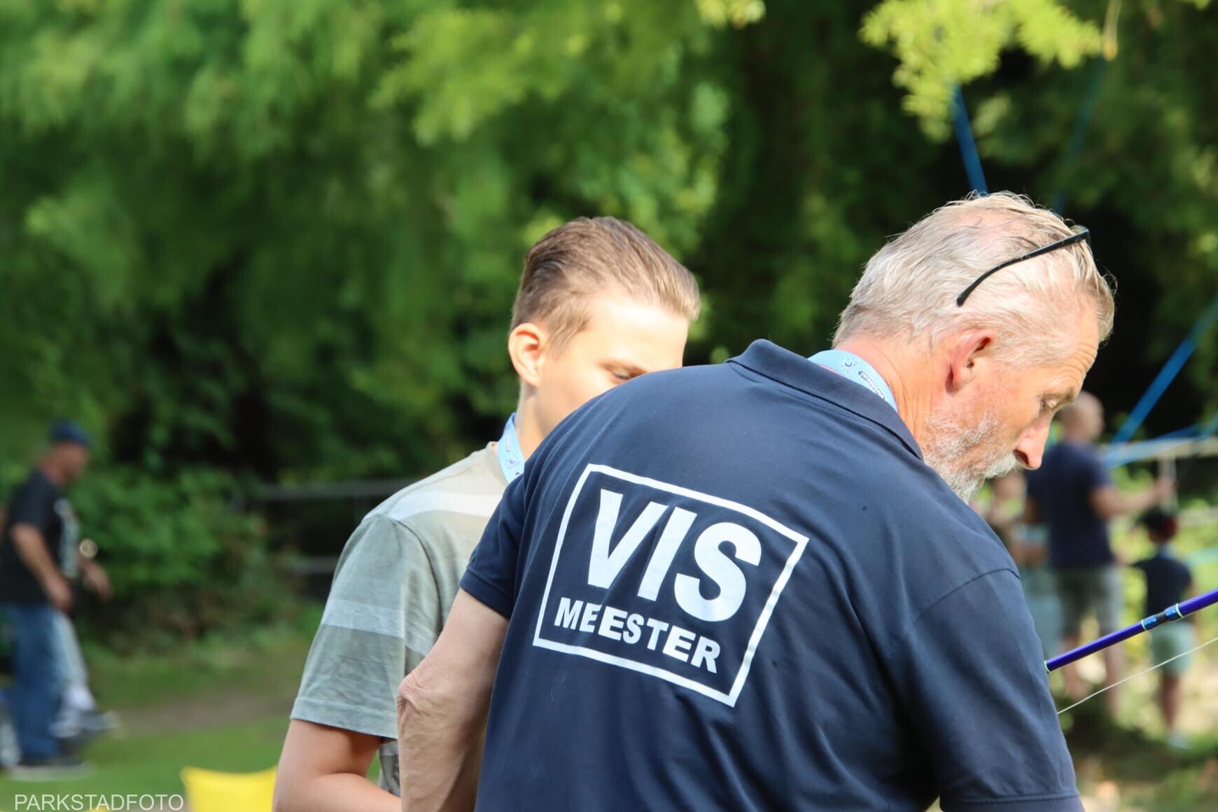Dit evenement was voor kinderen tussen 8 en 14 jaar. Het begon met de aanmeldingen en we mochten er maar liefst 77 ontvangen, dat beloofde een druk dagje te worden. De weer goden waren ons goed gezind ondanks dat er twee keer een heel paar druppels gevallen zijn. De mensen van Sportvisserij Nederland en een afvaardiging van Sportvisserij Limburg waren rond 8 uur bij ons aan de vijver na het gezamenlijk nuttigen van een heerlijk bakje koffie zoals altijd verzorgd door onze Huub Janssen. Daarna gingen we samen aan het werk, want voordat de kinderen arriveerden moesten we nog een tent voor de registratie, en later die dag ook als locatie waar de kinderen leerden hoe ze een tuigje moesten knopen,